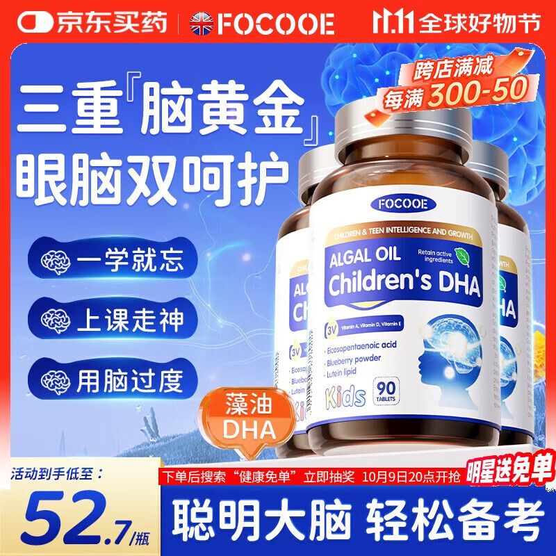 FOCOOE藻油dha学生补脑青少年6-18岁增加儿童3-12岁记忆力备考神经酸3瓶