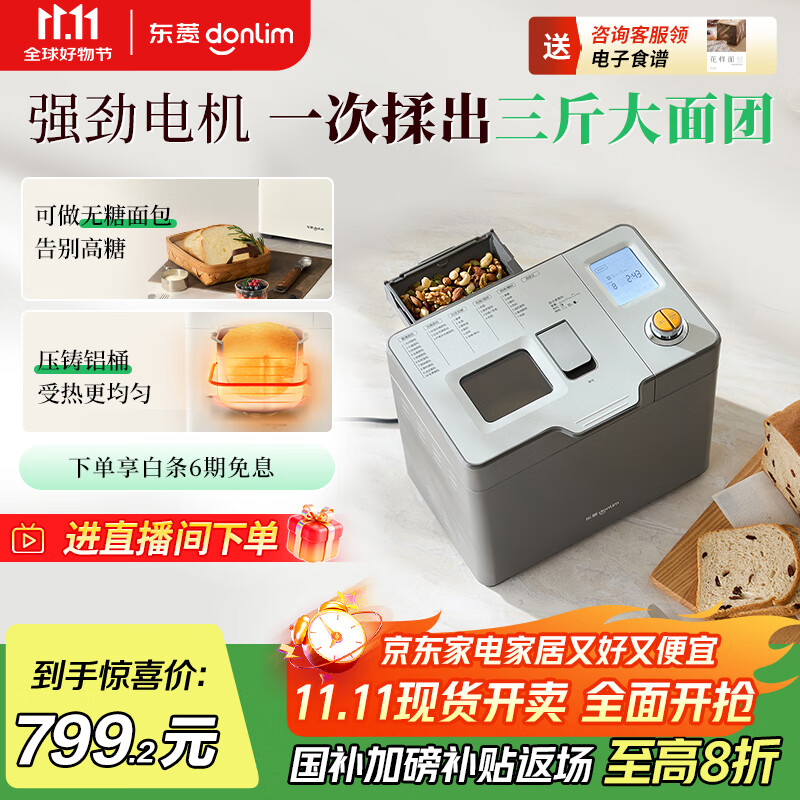 东菱(Donlim)【国家补贴】新款家用全自动无糖面包机 大容量 智能双撒 可预约 多功能和面机DL-1352灰色