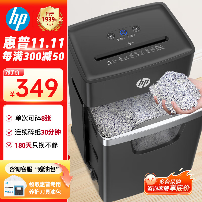 HP惠普 5级保密碎纸机办公中型商用粉碎机(连续碎30分钟 单次8张 20L 可碎卡/订书钉)黑金款B2008MC