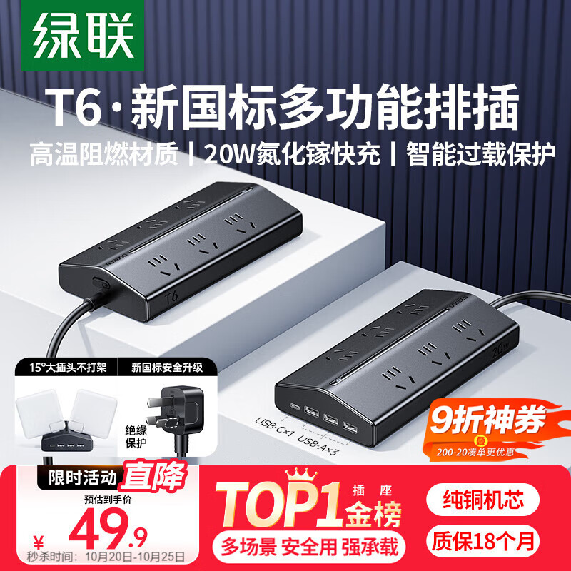 绿联T620梯形排插多功能插排USB插座氮化镓20W多口快充插线板过载保护宿舍电脑桌面办公接线板6位总控