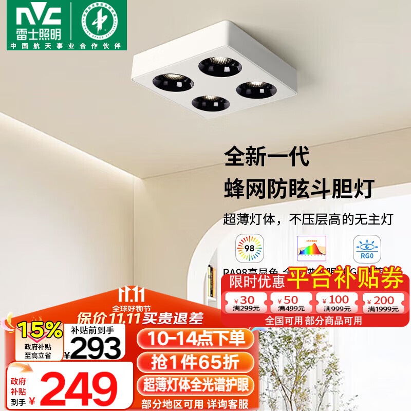 雷士(NVC)LED精品射灯方形吸顶明装斗胆灯超薄格栅灯四头COB40瓦黑杯暖白
