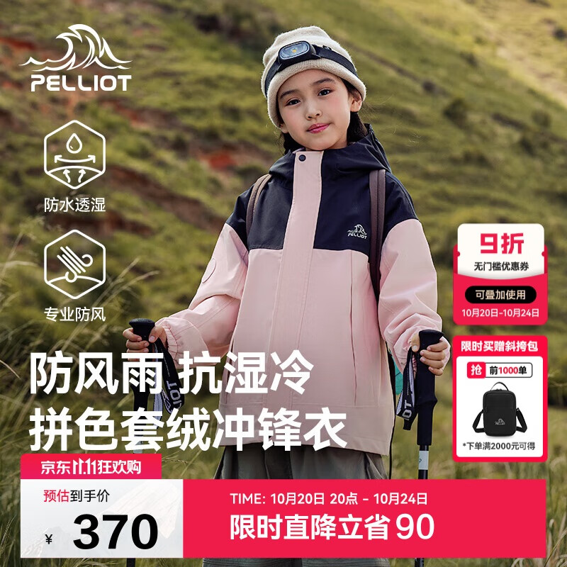 伯希和(Pelliot)户外儿童冲锋衣男女三合一防风防水春夏夹克外套134301043黑粉160