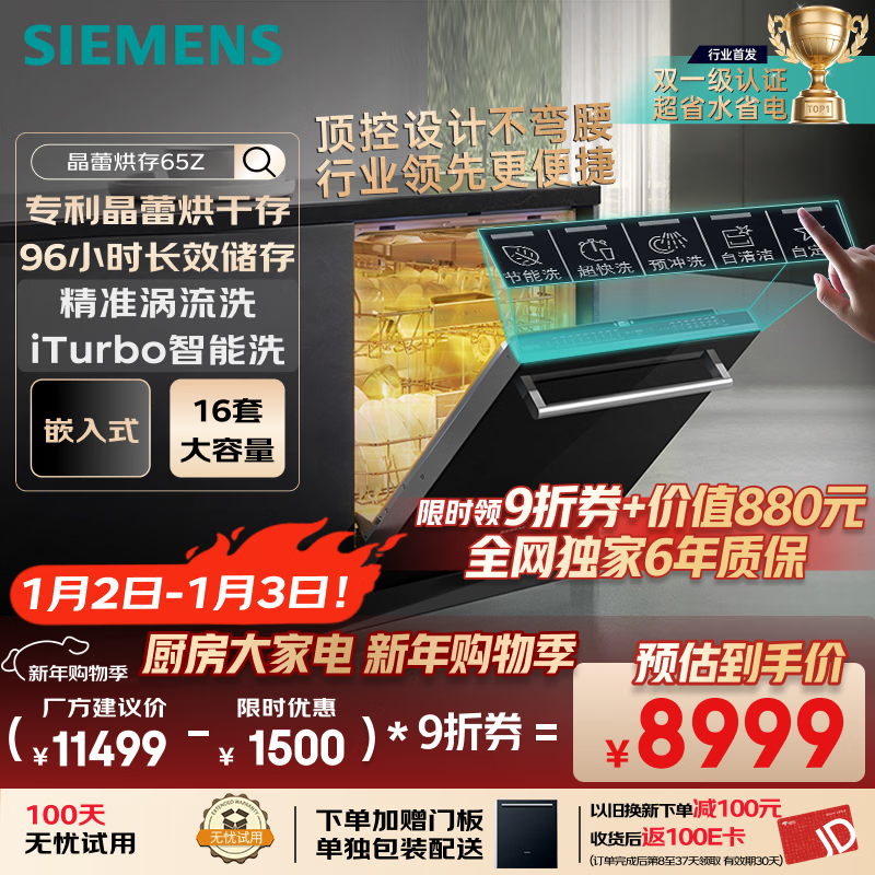 西门子洗碗机嵌入式16套晶蕾烘存双一级认证超省水省电黑魔镜 触控式SJ65ZX00MC(送黑玻璃门板)