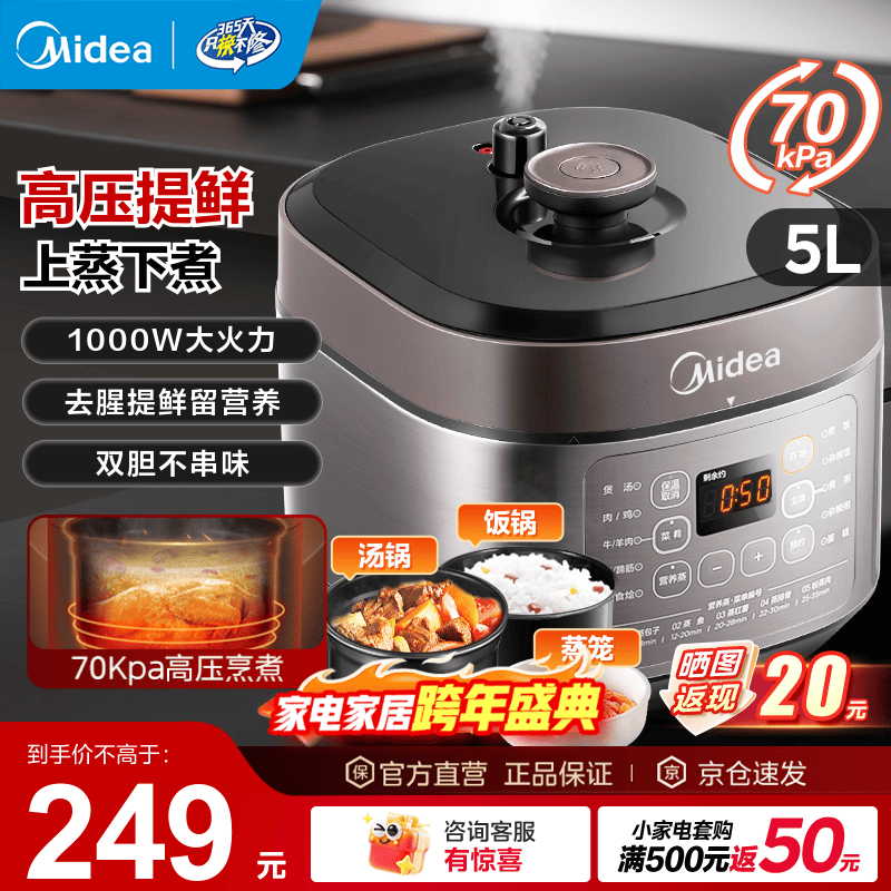 美的(Midea)电压力锅高压锅 电高压锅 智能压力锅家用高压电饭煲一键排气 新款多功能高压提鲜电压锅 【5L家庭版】MY-50M5-206- 5L 压力锅
