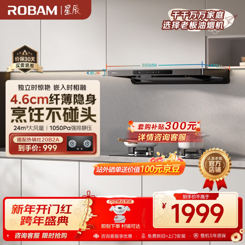 老板F30超薄欧式顶吸抽吸排油烟机24风量家用大吸力以旧换新一级能效可配燃气灶烟灶套装星辰60A0S