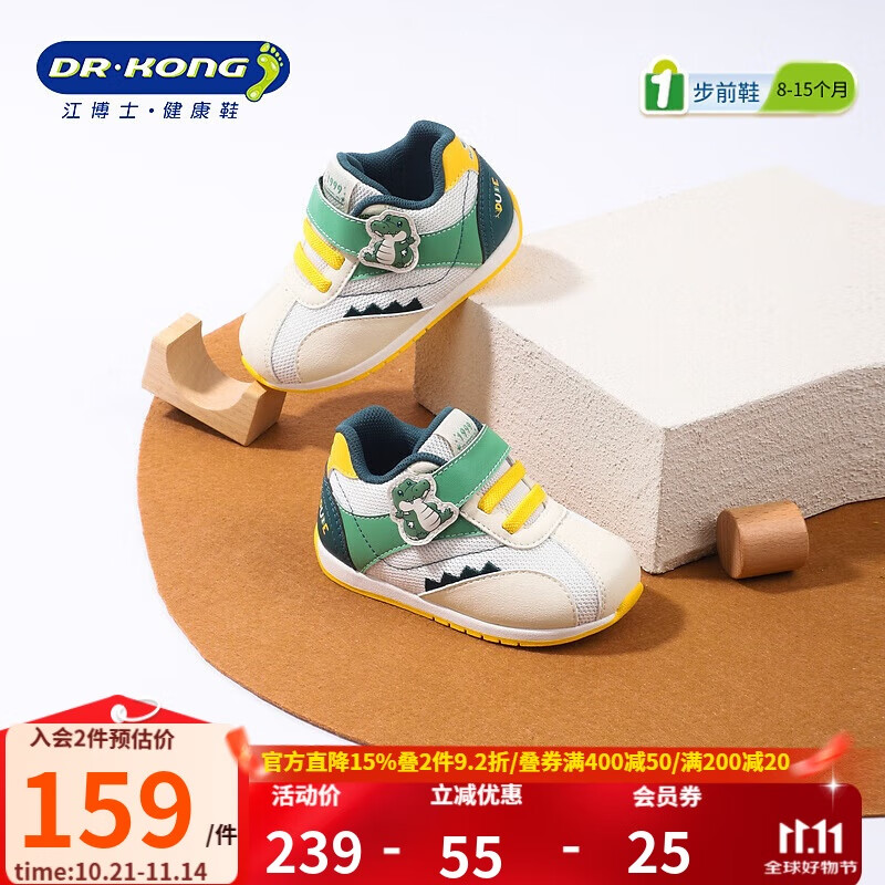 江博士秋季男女童步前鞋可爱卡通透气轻便易穿脱魔术贴宝宝鞋 米/绿 22