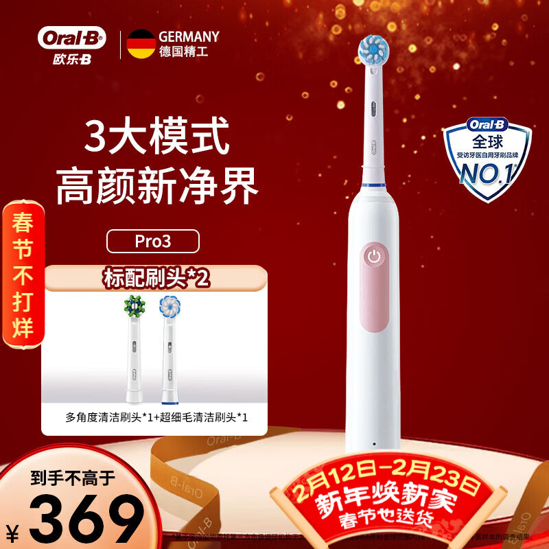 欧乐B电动牙刷充电式声波成人送男士女士小圆头软毛刷呵护深度清洁情侣情人节礼物Pro3/Pro4年会礼物 Pro3粉色(标配刷头*2)