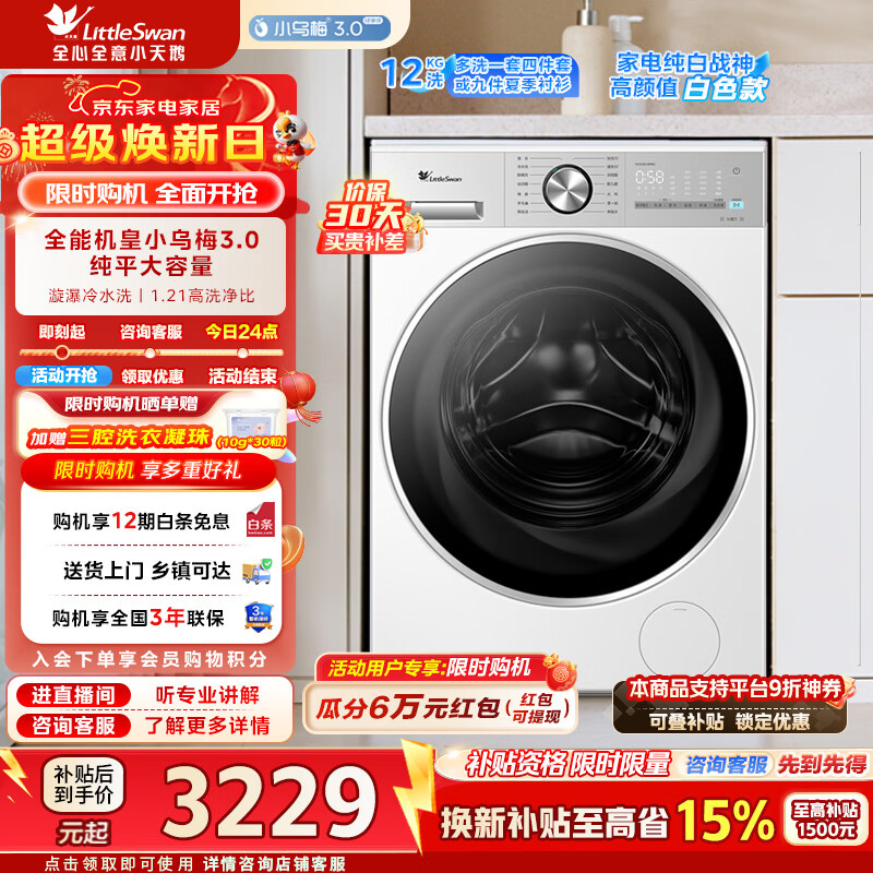 小天鹅(LittleSwan)12公斤滚筒洗衣机全自动家用纯平全嵌大容量净屑除毛一级能效补贴折扣 TG12VE10PRO【小乌梅3.0 轻享版】 滚筒