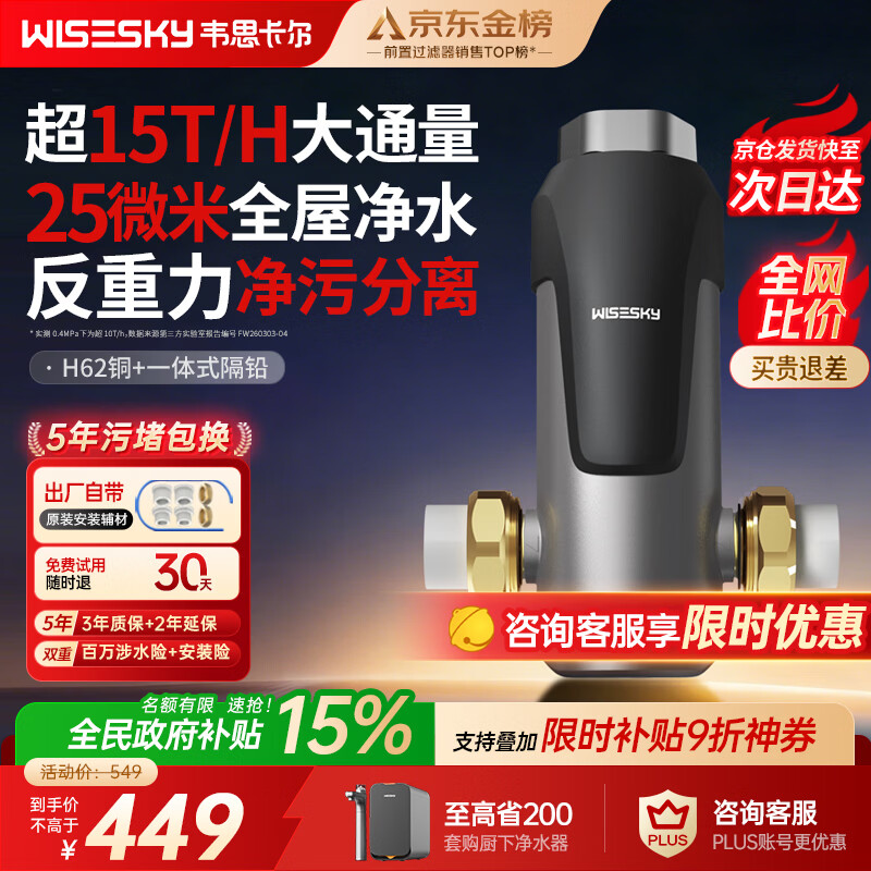 WISESKY韦思卡尔反重力前置过滤器大流量全屋家用反冲洗净水器80T自己安装
