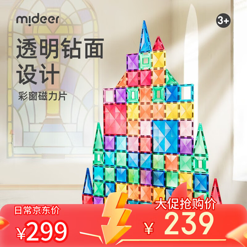弥鹿(MiDeer)儿童彩窗磁力片积木生日六一儿童节礼物棒磁铁磁吸益智玩具礼盒 100片钻面彩窗-含小车*2+收纳袋