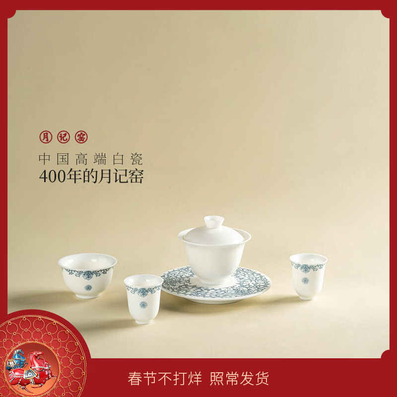 月记窑 “平步青云”羊脂玉瓷盖碗小套装 礼盒装