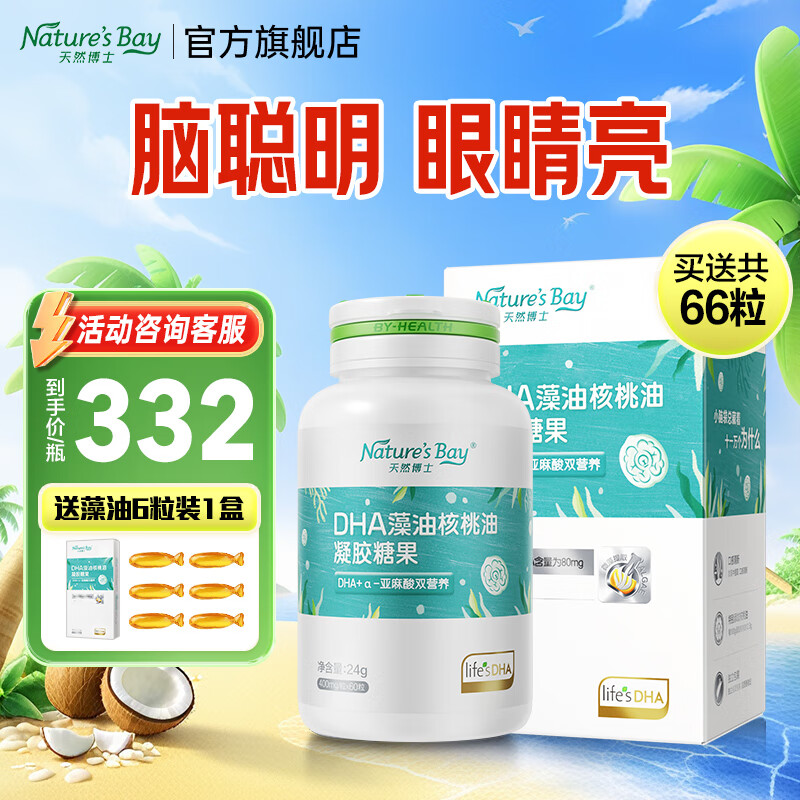 天然博士藻油dha儿童海藻油婴幼儿宝宝儿童孕妇乳母学生可食用DHA+核桃油 升级款双营养藻油60粒*1瓶