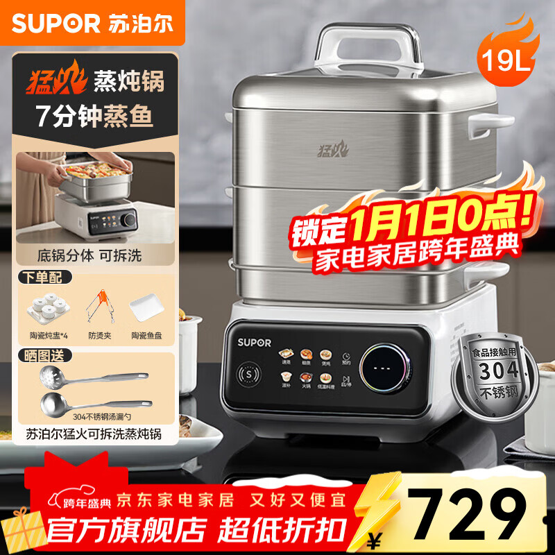 苏泊尔(SUPOR)猛火可拆洗电蒸锅 0涂层304不锈钢材质蒸笼19L大容量炖蒸煮一体多功能电蒸锅上蒸下炖隔水炖底锅 19L +2000W+不锈钢蒸笼+三层