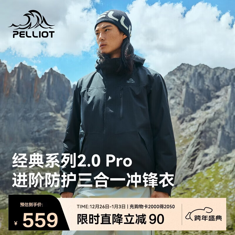 伯希和(Pelliot)【山野经典2.0Pro】冲锋衣三合一男女秋冬保暖外套115301098黑L