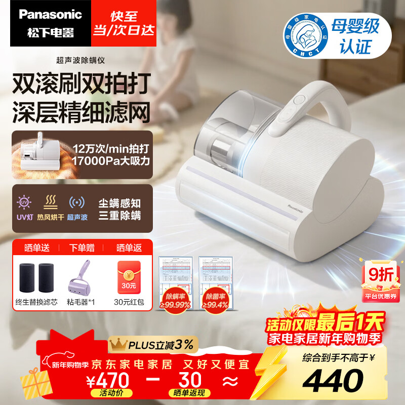 松下(Panasonic)【清洁神器】超声波除螨仪母婴级床宝家用床上吸尘器大吸力紫外线杀菌热烘除湿双滚刷双杯MC-DC25W