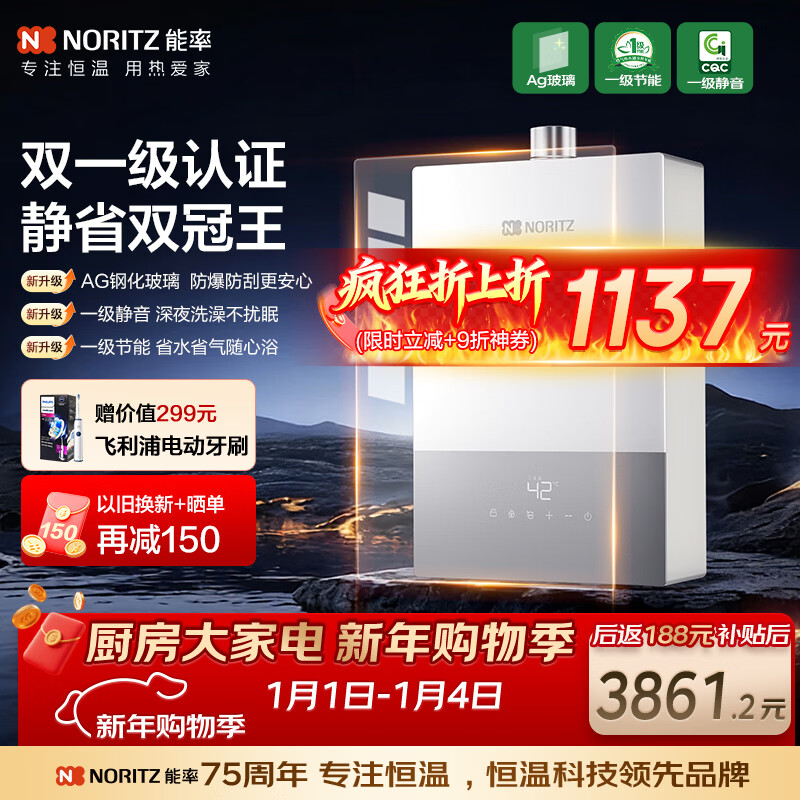 能率(NORITZ)【小云朵UP】16升燃气热水器 天然气 AG玻璃 一级静音 节能水伺服 16EX33AFEX