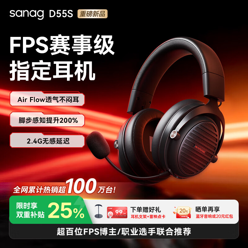 SANAG塞那D55S【冠军推荐热销100W+】耳机头戴式游戏电竞赛事级低延迟无线蓝牙有线2.4G四模电脑耳机