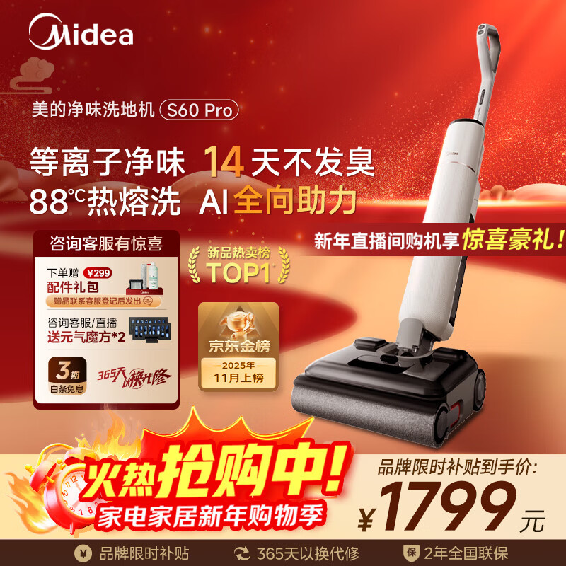 美的(Midea)S60Pro净味洗地机洗拖吸一体【AI全向助力 超薄躺平 高温自清洁】家用拖地机自动清洗 净澈S1升级