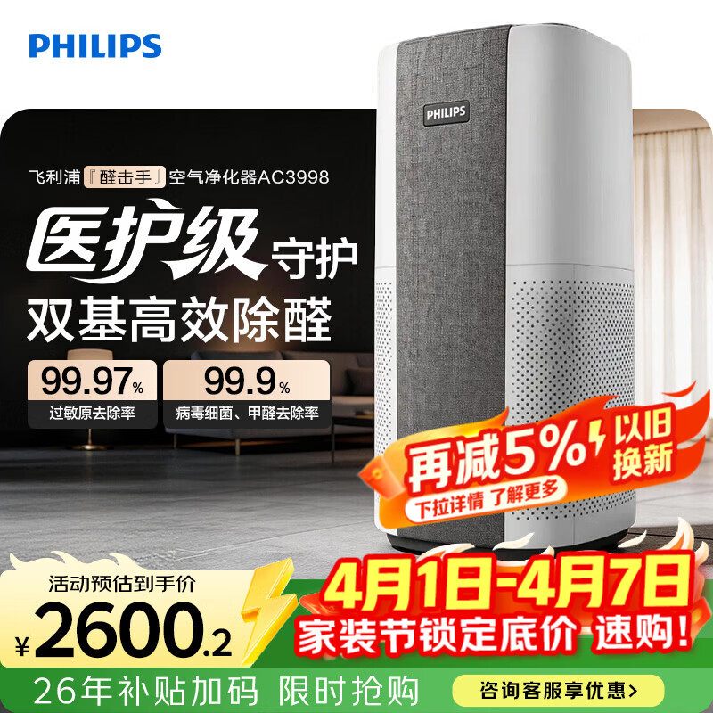 飞利浦(PHILIPS)空气净化器除甲醛烟味神器新房专业家用孕妇婴儿室内换气鼻炎杀菌净化机除螨尘花粉过敏原AC3998