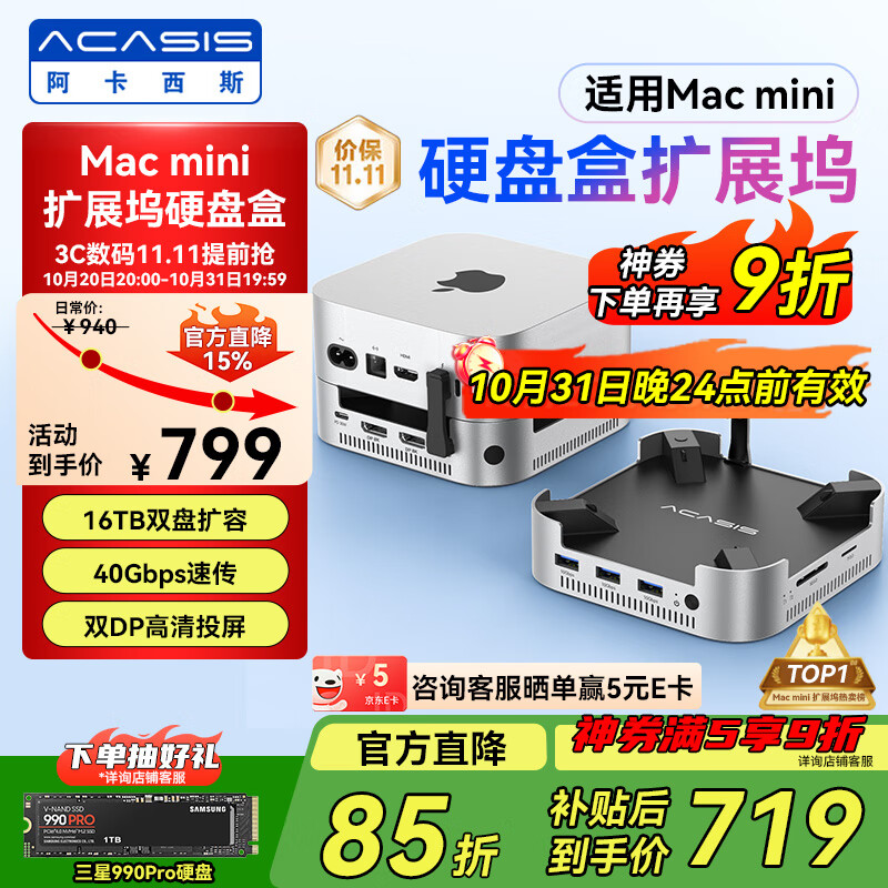 阿卡西斯(acasis)适用Macmini M4拓展坞硬盘盒40Gbps传输双DP投屏16TB扩容适配M4/M4Pro主机兼容雷电4/5接口M001Pro