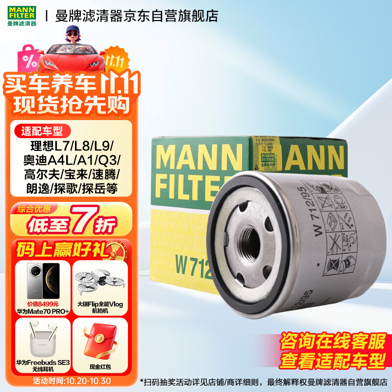 曼牌(MANNFILTER)机油滤清器机油滤芯机滤W712/95捷达宝来速腾朗行朗逸探歌蔚领高7