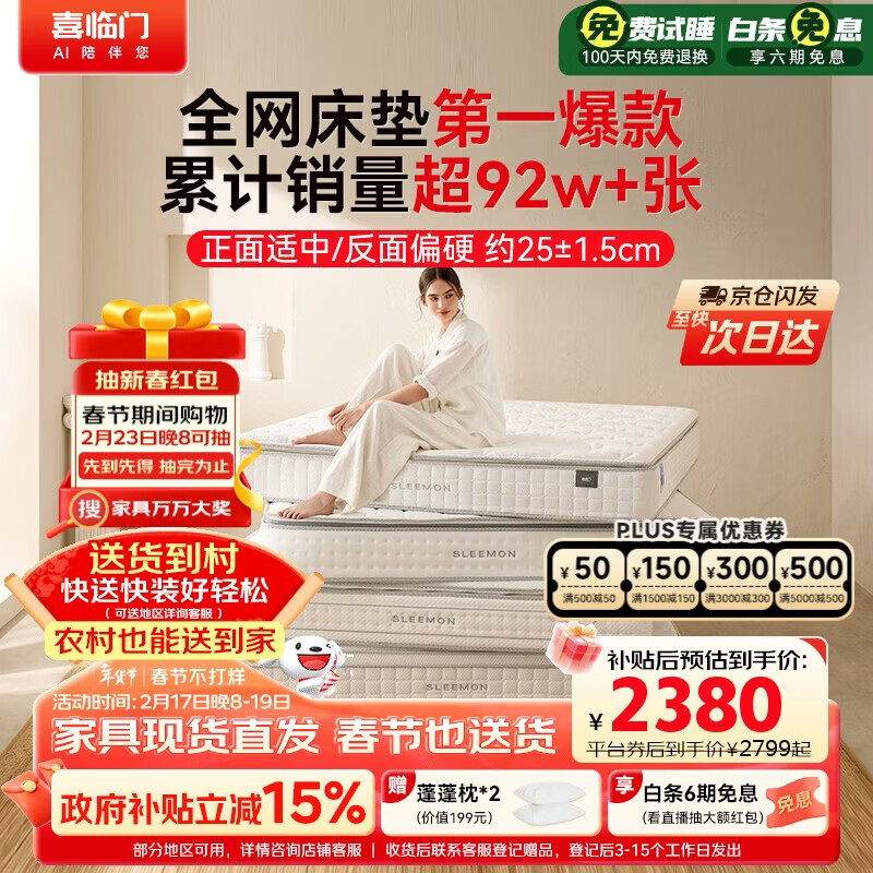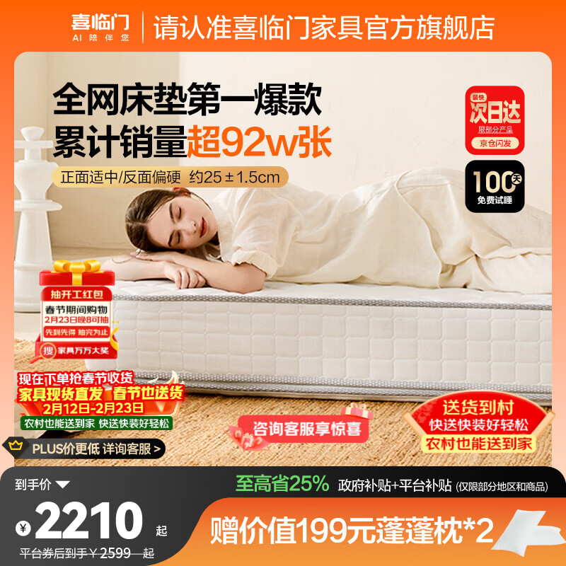 喜临门白骑士plus 2cm乳胶独袋弹簧床垫舒脊黄麻床垫 1.8x2米 软硬适中