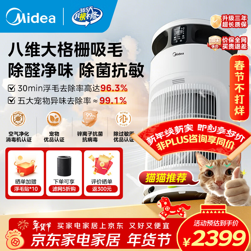 美的(Midea)宠物空气净化器强力吸毛 除猫狗异味抗菌除敏除甲醛 吸猫毛净化器小怪兽PET600【宠物专享升级款】