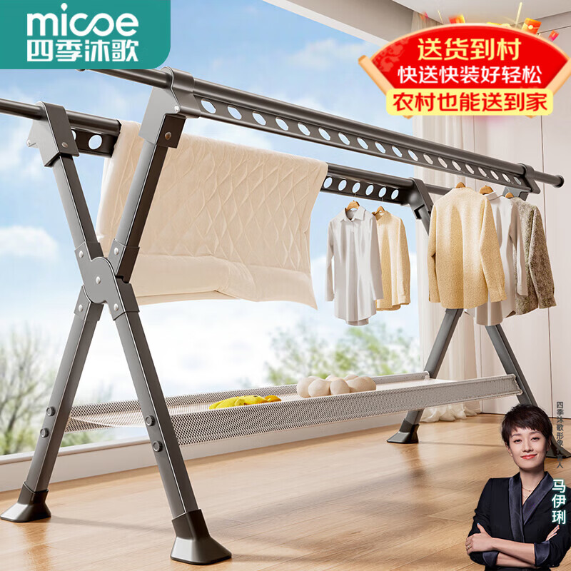 四季沐歌折叠晾衣架落地凉晒衣架铝合金家用晒被子阳台晾衣架晒衣架挂衣架 【铝合金款】可伸缩2.3m防风脚垫