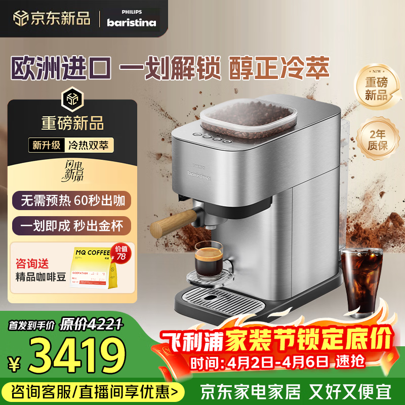 飞利浦(PHILIPS)【重磅新品】进口Baristina新型意式美式全自动/半自动家用 研磨一体冷萃小型咖啡机 bar pro 500