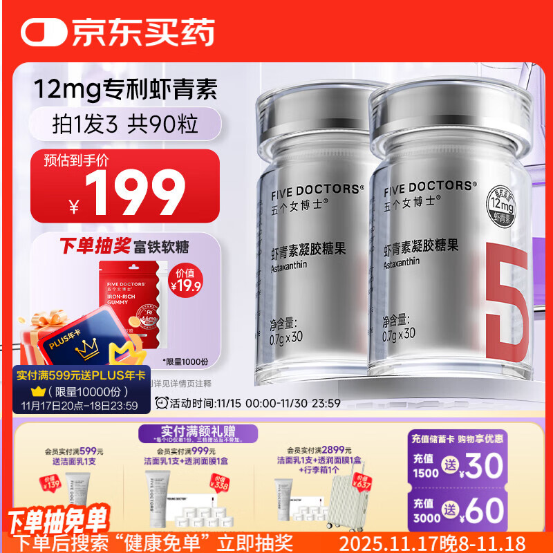 五个女博士 花少同款虾青素12mg雨生红球藻维生素E金顶侧耳进口白番茄 3盒装