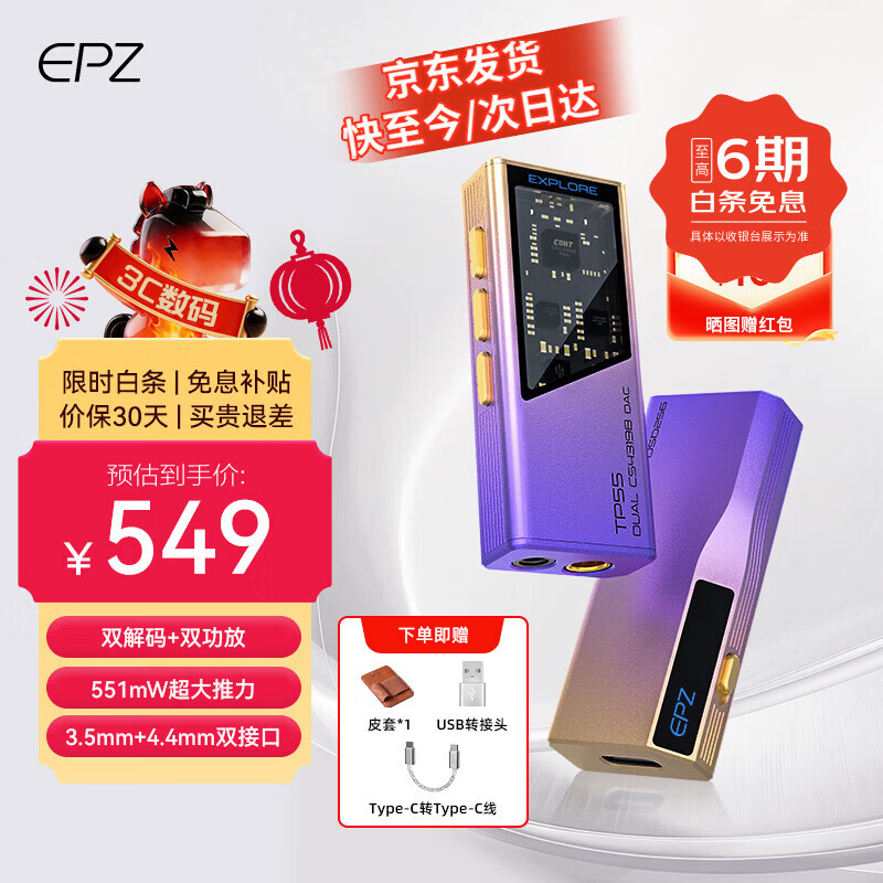 EPZTP55【下单送背夹】 旗舰级便携式音频功放解码耳放 HIFI小尾巴3.5/4.4放大器解码器游戏声卡通用 【京东仓】日照紫 10段调音【TYPE-C直插版】