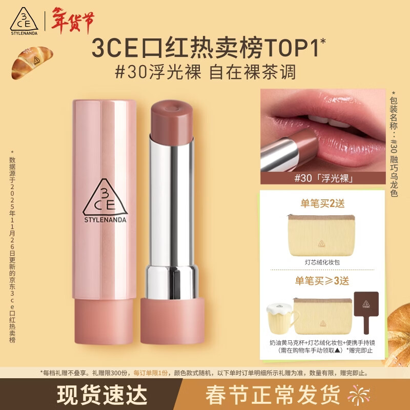 3ce好气色润唇膏浮光裸#30MELTINGSMORE唇釉口红生日礼物情人节