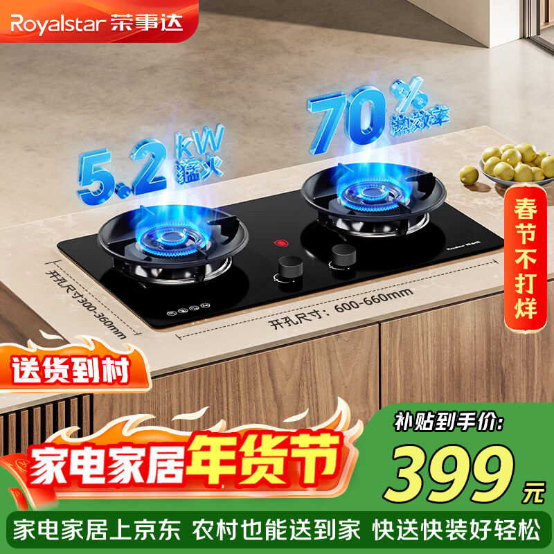 荣事达(Royalstar)燃气灶天然气双灶家用嵌入式5.2kW节能猛火灶具灶台 一级能效铜火盖可调节底盘 JZT-A535BFS