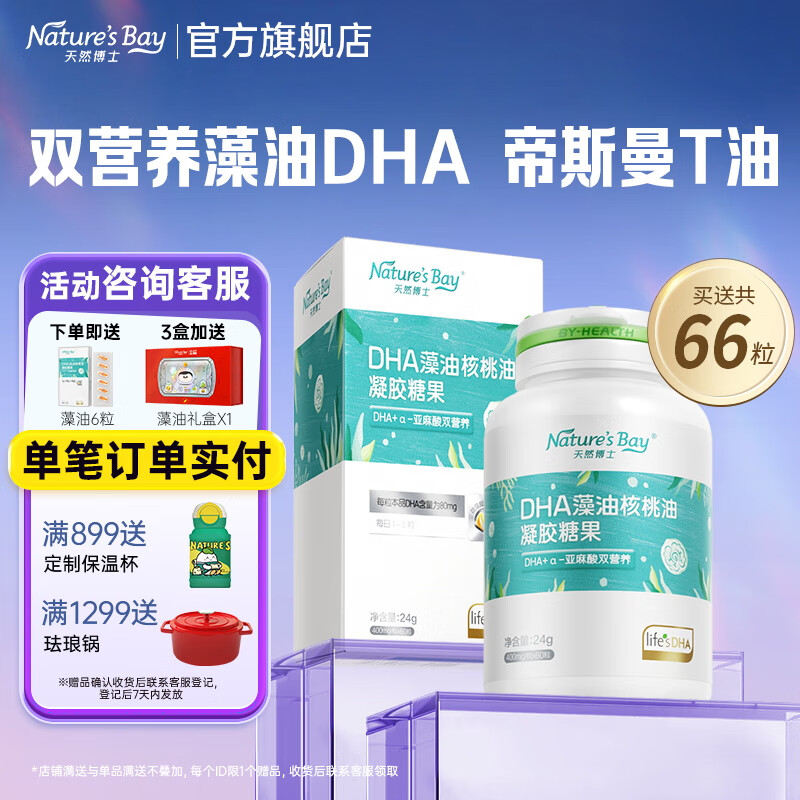 天然博士藻油dha 婴幼儿宝宝儿童孕妇乳母成人可食用DHA藻油软胶囊 双营养藻油dha 60粒*1盒 +6粒共66粒