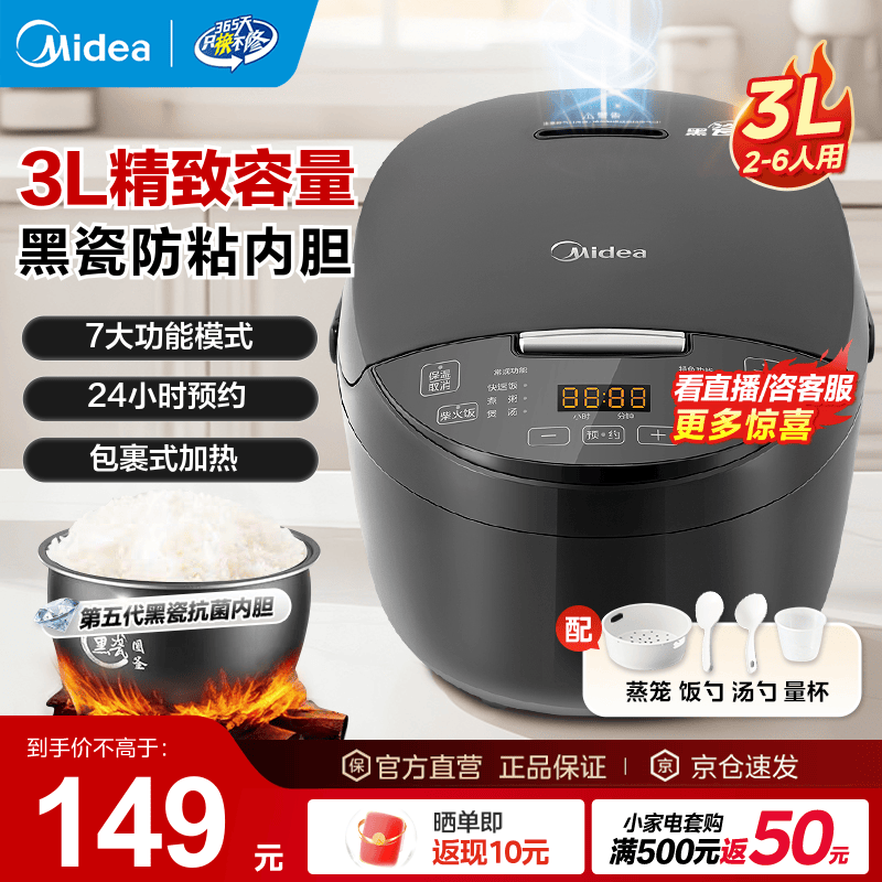 美的(Midea)电饭煲 黑瓷内胆电饭锅小型多功能全自动不粘煮饭锅微压蒸饭锅家用2-3-4-5-8人免弯腰智能预约 24小时预约 3L 精致容量