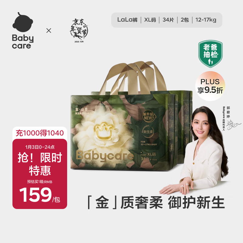 babycare金山茶花拉拉裤XL34片*2包(12-17kg)婴儿尿不湿超薄透气花苞裤