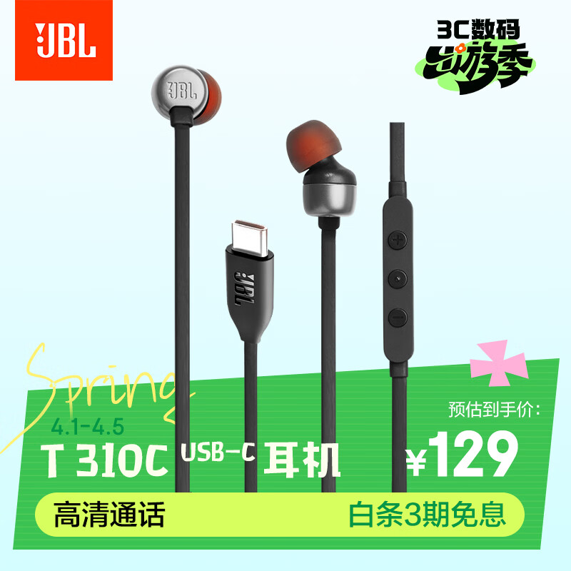 JBLTUNE310C有线耳机Type-C接口入耳式耳机 电脑耳机 适用于USB-c设备黑色