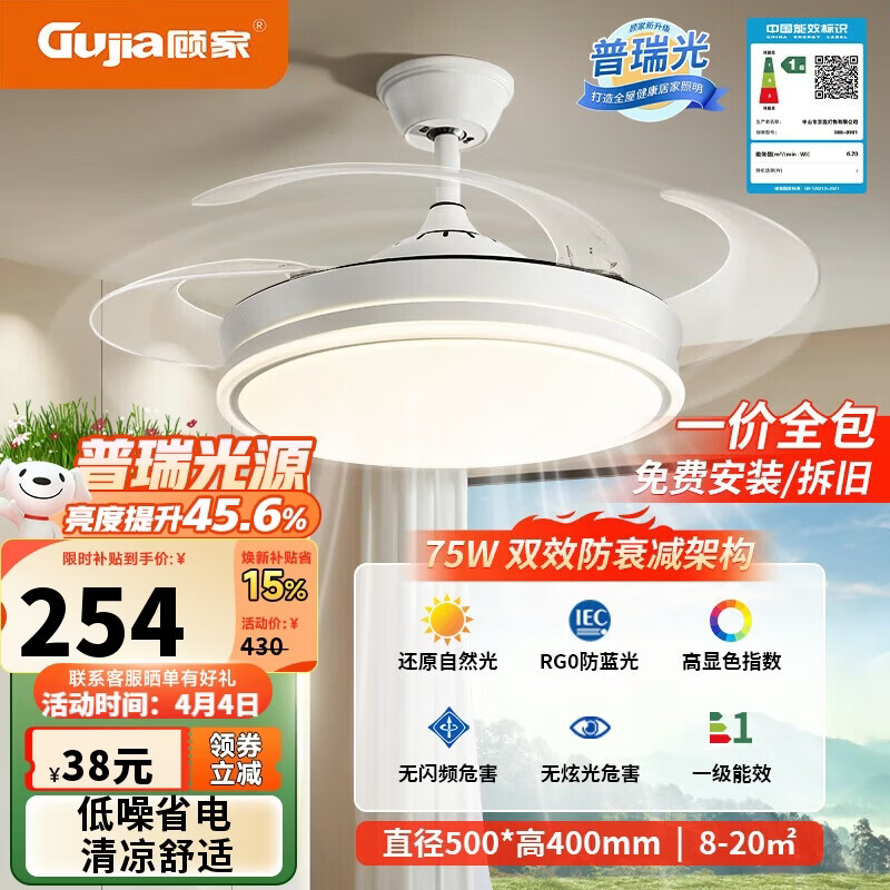 顾家隐形风扇灯客厅餐厅静音吊扇灯电扇吊灯具吊杆款-三色【包安装】
