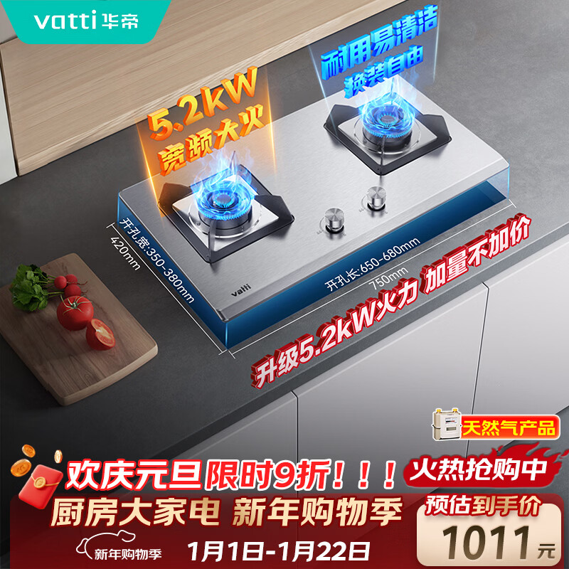 华帝官方不锈钢燃气灶煤气灶以旧换新嵌入式双灶5.2kW猛火灶具灶台i10065A【天然气产品】