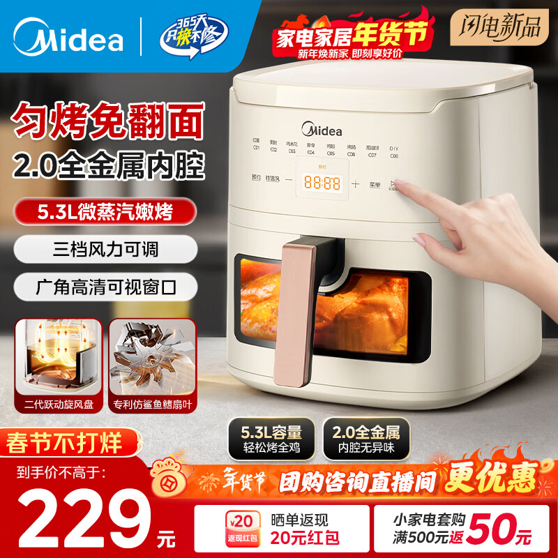 美的(Midea)空气炸锅大容量免翻面家用多功能电炸锅智能定时无油低脂煎炸锅炸鸡薯机条可视蒸烤一体空气烤箱 KZC5383D【三档风力可调】免翻面 5.3L