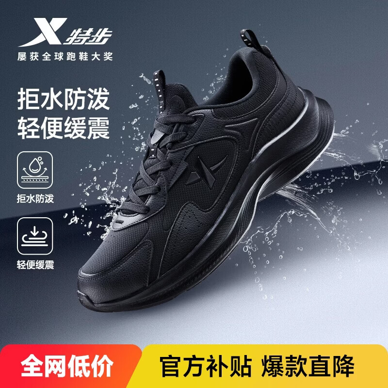 特步男子跑步鞋运动鞋轻便减震防泼水革面跑鞋黑色