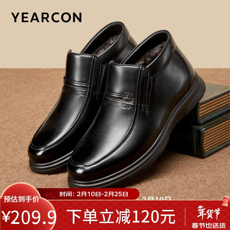意尔康男鞋绑带高帮加绒保暖休闲皮鞋商务休闲男棉鞋97216W 黑色 40