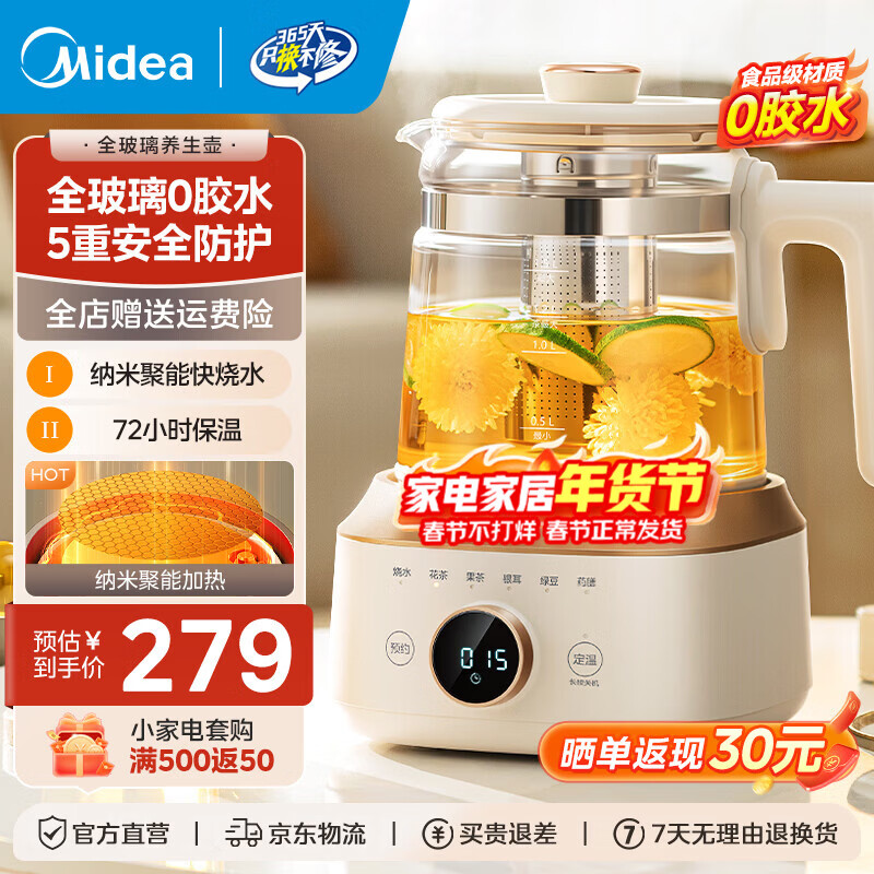 美的(Midea)全玻璃0胶水养生壶 多功能全自动烧水壶 母婴72小时恒温电热水壶花茶壶烧水壶1.5L MK-YS15B201 1.5L 【全玻璃大容量】0金属0胶水