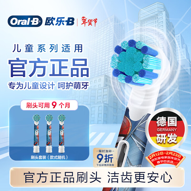 欧乐B儿童电动牙刷头3支蜘蛛侠适用D103KD100KPro1kidsEB10/EB10S-3K软毛(图案包装随机)【正品刷头】