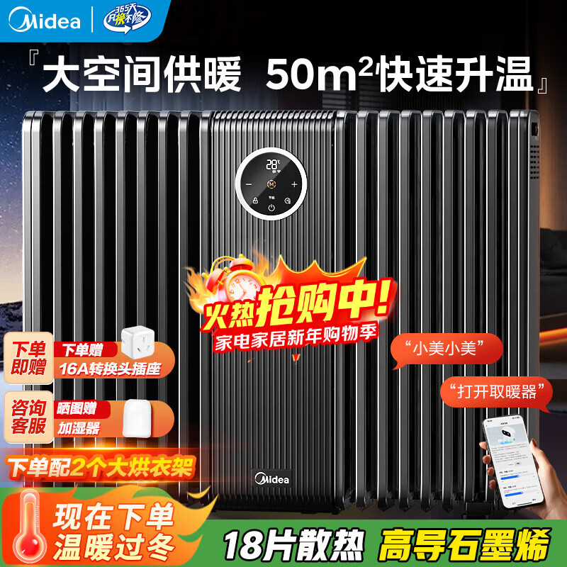 美的(Midea)石墨烯油汀取暖器全屋智能wifi语音油丁电暖器18片防烫电油酊母婴家用大面积电暖气片烘衣HYS30DQR