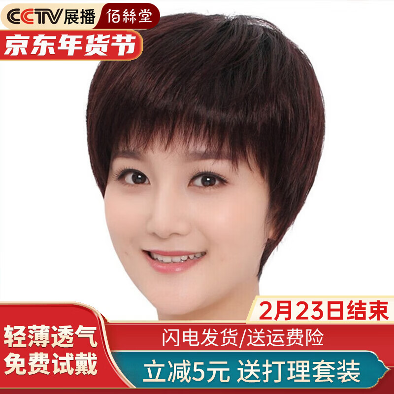 佰丝堂假发短发女短直发中老年送妈妈全头套女士真发全真人发丝自然透气 自然黑【50%真发】可调节大小