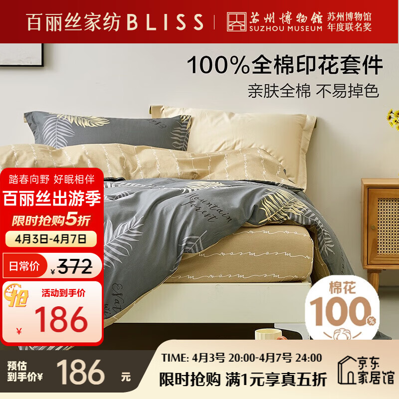 百丽丝水星家纺出品四件套100%棉纯棉床笠床上被套四件套双人床上用品1.8米床
