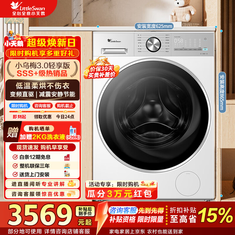 小天鹅(LittleSwan)小乌梅3.0轻享版 滚筒洗衣机全自动家用 12公斤大容量纯平水魔方带烘干洗烘一体 家电折扣补贴 TD12VE10PRO 洗烘一体