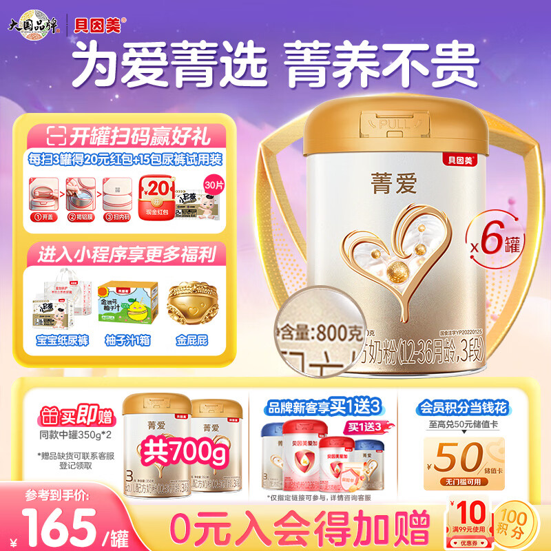 贝因美【焕新】菁爱12-36月幼儿配方奶粉3段800g*6 益生菌+双益生元
