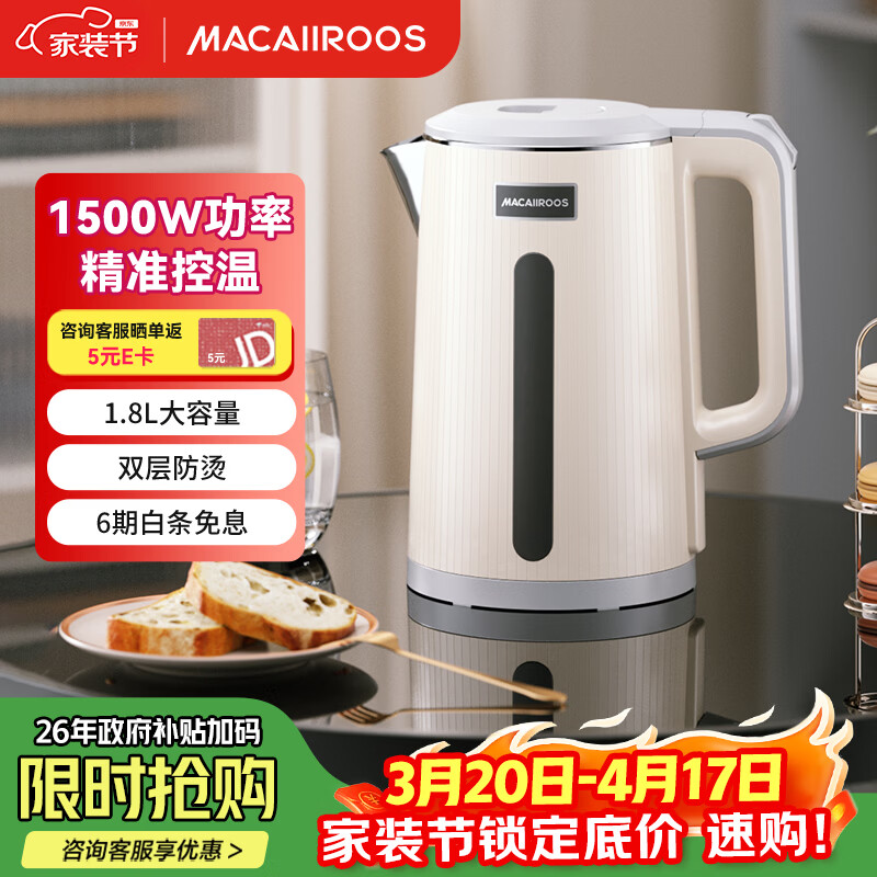 迈卡罗(Macaiiroos)电热水壶 不锈钢双层防烫 1.8L大容量 烧水壶暖水壶开水壶电水瓶
